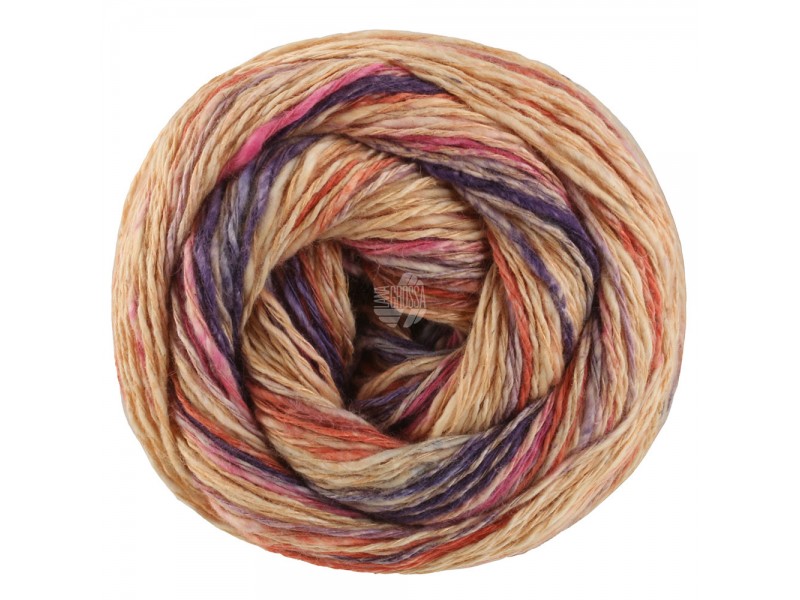 Gomitolo met een prachtige structuur, ideaal voor de zomer, met brede kleurige strepen, afgewisseld met poedertinten. Dit garen is gemaakt van katoen met hennep en linnen.