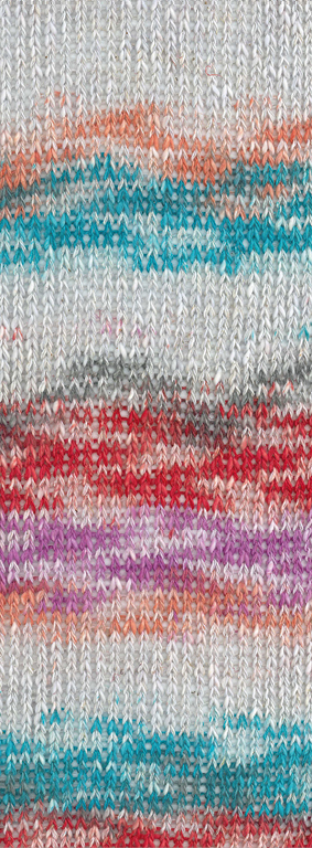 Gomitolo met een prachtige structuur, ideaal voor de zomer, met brede kleurige strepen, afgewisseld met poedertinten. Dit garen is gemaakt van katoen met hennep en linnen.
