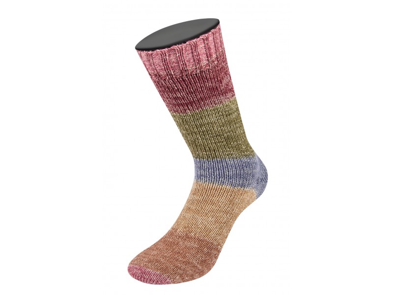 Sokkenwol van merinowol, dus extra zacht en warm! Met een stonewashed effect en in brede strepen. Met weinig moeite zijn 2 dezelfde sokken te breien.