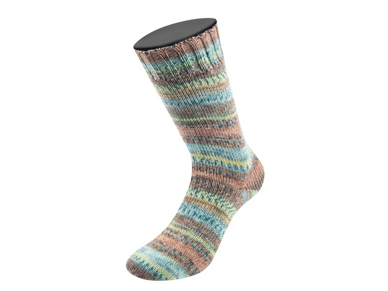 Sokkenwol met merinowol en zijde. Verkrijgbaar in mooie kleurcombinaties. Het patroon bestaat uit strepen en patroontjes.