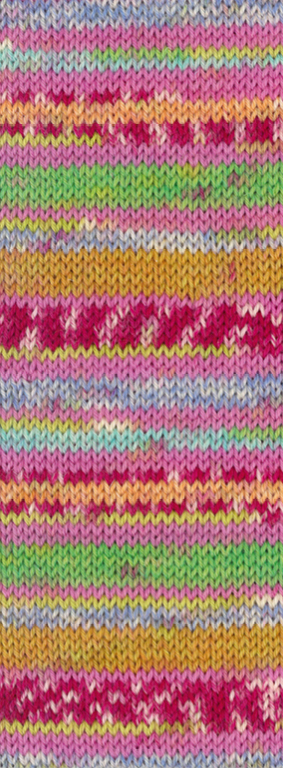 Leuke, vrolijke sokkenwol voor naalddikte 3 tot 4. Verkrijgbaar in 6 intense kleuren, waaruit een  stippel- en streeppatroon ontstaat.
