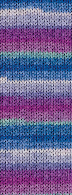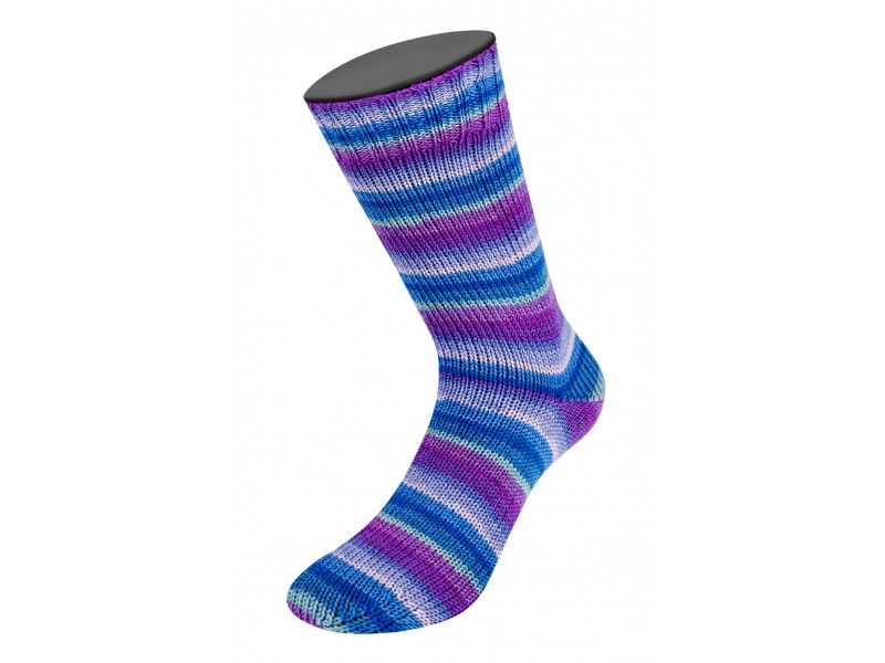 Dikke sokkenwol voor naalddikte 3 tot 4. Verkrijgbaar in 6 intense kleuren, waaruit een streeppatroon ontstaat.